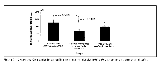 Realizando-se a comparação múltipla pareada (Método de Dunn), encontramos o seguinte: a elastância do sistema respiratório do grupo estudo 1 (papaína sem cirurgia) foi estatisticamente menor do que a elastância do grupo controle A (solução fisiológica sem cirurgia) (p < 0,05); a elastância do sistema respiratório do grupo estudo 1 (papaína sem cirurgia) foi estatisticamente menor que a elastância do grupo estudo 2 (papaína com cirurgia) (p < 0,05); para os demais grupos não houve diferença estatisticamente significativa. Realizando estudos morfométricos com análise do diâmetro alveolar médio (Lm), obtivemos os seguintes resultados (Figura 2) para a média do diâmetro alveolar médio: grupo estudo 1 (solução de papaína sem cirurgia) de 146,61mm; grupo estudo-2 (solução de papaína com cirurgia) de 109,67mm; grupo controle A (solução fisiológica sem cirurgia) de 75,90mm; grupo controle B (solução fisiológica com cirurgia) de 62,68mm; e grupo controle C (solução de papaína sem cirurgia e sem ventilação mecânica) de 100,56mm..