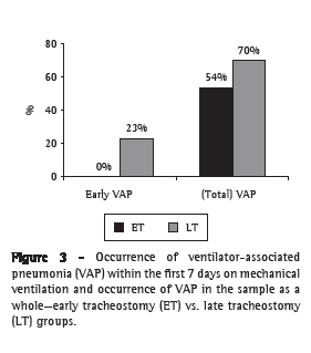 None of the ET group patients developed VAP within the first 7 days of MV, compared with 4 (23%) of the LT group patients (p = 0.13). Taking into consideration the entire hospitalization stay, 6 (54%) of the ET group patients and 12 (70%) of the LT group patients developed VAP (p = 0.44; Figure 3).