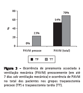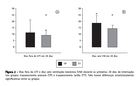 Outros dois resultados, embora não tenham alcançado significância estatística, sugerem benefícios com a traqueostomia precoce: menor ocorrência de PAVM precoce (ocorrida nos primeiros 7 dias de VM) e maior número de dias fora da VM dentro dos primeiros 28 dias de internação. Os pacientes do grupo TP não apresentaram PAVM precoce, enquanto ela ocorreu em 23% no grupo TT (p = 0,23). Apesar da diferença entre as proporções, ela não alcançou significância estatística, provavelmente pelo pequeno número de pacientes avaliados.