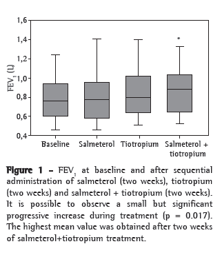 Salmeterol and tiotropium have been compared in longer studies.(22,23) In general, those studies suggest that the bronchodilator and clinical response produced by tiotropium are slightly superior but of little clinical significance. As a consequence, recent guidelines suggest that symptomatic patients with COPD should be initially treated with a long-acting ­bronchodilator in isolation and that there is insufficient evidence to recommend one drug over the other.(24) Our findings allow us to infer that patients who continue to have class III to IV dyspnea, as measured by the MRC scale, despite the use of β2 agonists, can benefit from the use of tiotropium in isolation. More recently, the combination of these two drugs has been evaluated. In a one-year study of 449 patients, it was demonstrated that adding tiotropium to the salmeterol-fluticasone combination had a beneficial effect on quality of life, pulmonary function and hospital admission rates, when compared with the use of tiotropium in isolation.(25)