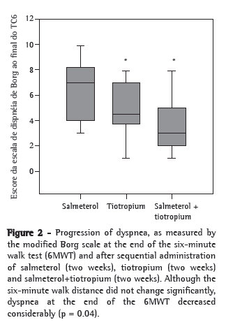 At the second visit (D15), the spirometric measurements were taken again and the degree of dyspnea was reassessed. Patients who scored between 3 and 4 on the MRC dyspnea questionnaire and had a post-bronchodilator FEV1 < 50% of predicted were maintained in the protocol, since the objective of the study was to evaluate patients who continued to experience dyspnea on minimal exertion despite the use of a long-acting β2 agonist. Those who showed improvement in functional class or a decrease in the degree of dyspnea between D0 and D15 were excluded from the study, as were those who had an exacerbation or who did not adhere to the prescribed treatment in those first two weeks.