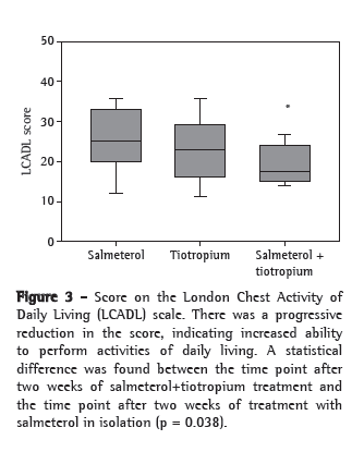 It is also noteworthy that, when analyzing the outcomes of the study, we demonstrated that the use of salmeterol+tiotropium in symptomatic patients previously being treated with one drug in isolation led to such improvement in functional and clinical parameters that their performance of activities of daily living improved. The gains were both clinical and functional, which is in agreement with the findings of the studies previously cited, and did not seem to result from the placebo effect. The two drugs seem to have a true additive effect, even in the short term.