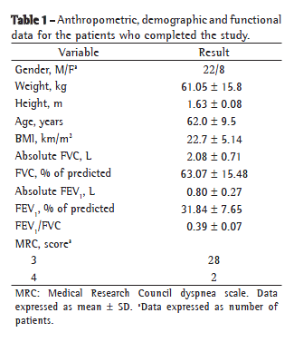 Table 1 shows the demographic, anthropometric and functional data related to the 30 patients who completed the study. Table 2 summarizes the results of the protocol at the four visits.