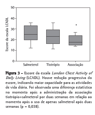 A avaliação de atividades cotidianas pelo escore LCADL foi realizada nas três últimas visitas. Os valores médios foram de 25,4; 23,1; e 19,7, respectivamente, em D15, D30 e D45. Essa redução progressiva ao longo do protocolo mostra uma limitação significativamente menor com a associação tiotrópio + salmeterol (p = 0,038; Figura 3).