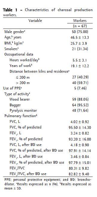 Table 4 shows the comparison between workers in terms of pulmonary function parameters, by smoking status. These data showed that smoking was associated with worsening of pulmonary function in the charcoal production workers, since the values of FVC and FEV1 were significantly lower in smokers.