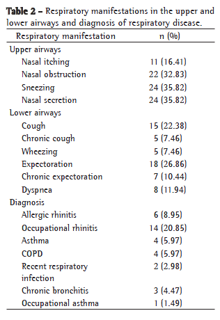 In the present study, allergic rhinitis was observed in 6 (9%) of the 67 workers investigated, and occupational rhinitis was observed in 14 (20.9%). This is lower than the prevalence found in the study involving fertilizer production workers in the city of Rio Grande, Brazil (43.3%),(8) and lower than that found in a study involving bakers in Europe (40.2%).(12)