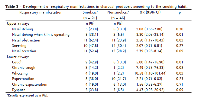 Of the charcoal workers investigated in the present study, one third (31.34%) had been exposed to tobacco smoke at some point in their lives (smokers and former smokers). Nasal itching when the kilns were operating, cough, nasal obstruction and wheezing were more common in smokers than in those who had never smoked (Table 3). A study involving grain workers in certain cities in Canada reported that smokers were more likely to develop cough, expectoration, wheezing and dyspnea than were nonsmokers. According to the same study, former smokers were more likely to develop expectoration, dyspnea and wheezing than were nonsmokers.(9) In Croatia, the prevalence of wheezing and nasal secretion among workers exposed to tobacco dust in tobacco plantations was higher in smokers than in nonsmokers.(19) The same type of additive effect was detected in firefighters in the USA, cough and expectoration being more common in firefighters who smoked than in those who did not.(20)