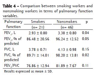 The means of FVC and FEV1 were significantly lower in charcoal workers who smoked than in those who did not (p < 0.05). This result was similar to that of a study involving fertilizer production workers, in which it was demonstrated that the pulmonary function of smoking workers was significantly lower than was that of nonsmoking workers.(8)