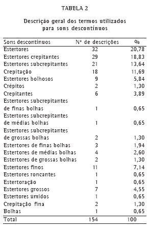 A Tabela 1 mostra a descrição dos ruídos contínuos na ausculta pulmonar. Foram referidas seis nomenclaturas diferentes, totalizando 266 descrições dos termos. Sibilos apresentou maior número de descrições (36,1%), seguido de sibilância (26,3%) e roncos (19,2%). Já para os ruídos descontínuos, houve 154 descrições com vinte termos variados (Tabela 2). O termo estertores respondeu por 20,7% das descrições, seguido de estertores crepitantes (18,8%) e estertores subcrepitantes (13,7%).