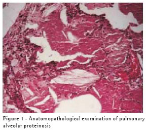 Rheumatologic tests and serology for the human immunodeficiency virus were negative. It was then decided that, in order to investigate the diffuse pulmonary interstitial process, a pulmonary biopsy should be conducted, the anatomopathological examination of which confirmed PAP.