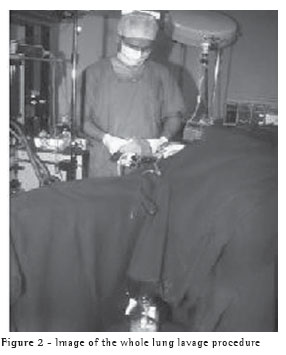 Three of the four patients (three females) were submitted to whole lung lavages, all carried out by the same surgeon, in operating rooms, according to the technique described by Ramirez-Rivera et al. in 1965, (14) under general anesthesia and double-lumen endotracheal tube intubation. In this technique, both lungs are initially well isolated, and the capacity of the lung to be infused is measured. Lavages are repeatedly made with heated saline solution, to which heparin (1.5 ml for each bottle of solution) and N-acetylcysteine are added. Using a gravity feed, the solution is slowly poured into the lung for a lavage. When the measured volume is reached, infusion is ceased and another passage is opened, which, due to gravity, combined with siphonage, drains the corresponding lung (Figure 2).