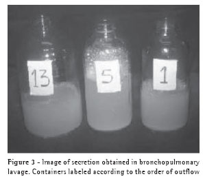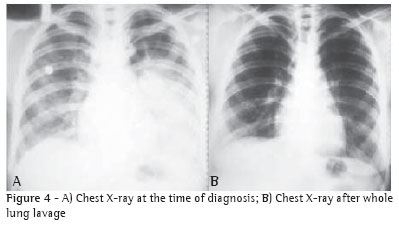 With the diagnosis confirmed, two months of pharmacological outpatient treatment was carried out at another facility. However, there was no clinical improvement; the patient presented persistent cough, pulmonary suppuration and fever. Bronchopulmonary lavage (BPL) was then proposed and was conducted initially in the right lung, since, judging from the chest X-ray, it was the most affected (Figure 4A). Pre-BPL arterial gasometry demonstrated arterial oxygen tension (PaO2) of 39mmHg, arterial carbon dioxide tension (PaCO2) of 28.7 mmHg and arterial oxygen saturation (SaO2) at 69%.