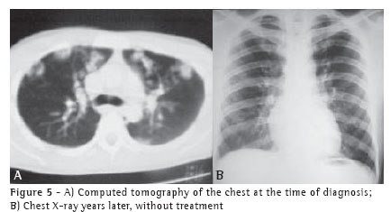 Case 4A 22-year-old, white, male patient was referred to our facility and presented cough without expectoration, daily fever and weight loss. A chest X-ray showed nodular bilateral lesions, confirmed by a computed tomography scan of the chest (Figure 5A). Routine tests were inconclusive, and an open lung biopsy was proposed. The result of the anatomopathological examination was consistent with PAP. Since the respiratory symptoms were of low intensity, we opted for conservative treatment. Over the years, the condition of this patient has remained unchanged. He performs regular daily activities, and his chest X-rays present few alterations (Figure 5B).