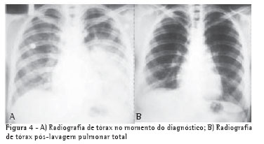 A radiografia de tórax (Figura 4B) mostrou uma boa evolução, com imagem praticamente normal, inclusive no pulmão esquerdo, o qual não foi lavado.