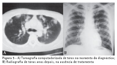Caso 4Um paciente de 22 anos (sexo masculino), branco, foi encaminhado ao serviço com quadro de tosse improdutiva, febre diária e perda de peso. Ao exame radiológico do tórax apresentava lesões bilaterais nodulares, o que foi confirmado pela tomografia computadorizada de tórax (Figura 5A).