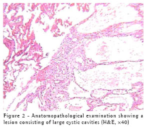 The differential diagnosis includes lymphangioma, papillary adenoma and sclerotic hemangioma.(2,8) Lymphangioma, as well as alveolar adenoma, has a multicystic appearance. However, alveolar adenoma is epithelial in nature, whereas lymphangioma is vascular. This can be confirmed by immunohistochemical analyses: positive for keratin and negative for factor VIII.(2) Papillary adenoma is a lesion that, similar to alveolar adenoma, is covered predominantly with type pneumocytes. However it differs from alveolar adenoma because it is devoid of the multicystic aspect.(8) In addition, some cases of papillary adenoma present invasive potential, unlike the alveolar adenoma, which is totally benign.(8) Sclerotic hemangioma presents a mixture of aspects (solid, vascular, sclerotic and papillary) and therefore differs from alveolar adenoma.(2)