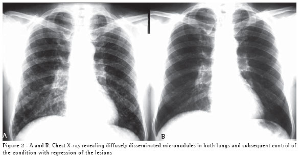 A 50-year-old white male, resident of the city of Blumenau and a stonemason, presented a clinical profile similar and simultaneous to that described in Case 1 ten days after the cleaning of the same area, in which there was bat guano. The patient was exposed to a large quantity of dust in an enclosed space. The patient was hospitalized for seven days. Two chest X-rays, one presenting diffusely disseminated micronodules in both lungs and one showing the subsequent control of the condition, are shown in Figures 2A and 2B.