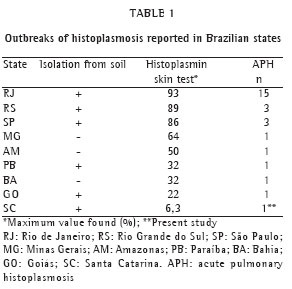 Since 1958, 26 outbreaks of histoplasmosis have been reported, all occurring in one of eight Brazilian states (Rio de Janeiro, Rio Grande do Sul, São Paulo, Distrito Federal, Minas Gerais, Paraíba, Amazonas and Bahia), and the fungus was isolated from soil in five of those states (Rio de Janeiro, Rio Grande do Sul, São Paulo, Distrito Federal and Paraíba).(5) Herein we describe the first outbreak of acute pulmonary histoplasmosis in which H. capsulatum was isolated at the focus of the epidemic in the state of Santa Catarina.