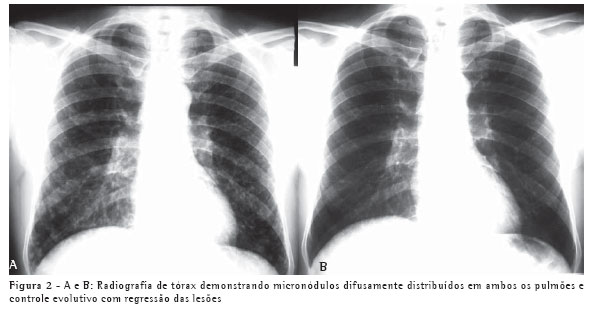 Um paciente, do sexo masculino, branco, de 50 anos, procedente de Blumenau, pedreiro, iniciou quadro semelhante e simultâneo ao do caso 1, dez dias após a limpeza da área referida com presença de fezes de morcego, ficando exposto a grande quantidade de poeira em ambiente fechado. Esteve hospitalizado por sete dias. O aspecto radiológico do tórax, apresentando micronódulos difusamente distribuídos em ambos os pulmões, e o controle evolutivo são demonstrados nas Figuras 2A e 2B.