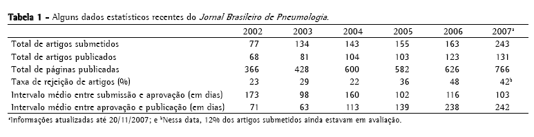 O número crescente de artigos submetidos trouxe, ainda, outras duas conseqüências: o aumento das taxas de rejeição de artigos e o alongamento do tempo entre a aceitação do manuscrito e sua publicação impressa. Um periódico científico não tem condições de publicar todo o material que lhe é submetido. Além de isso não ser viável, por razões econômicas e operacionais, também não é desejável do ponto de vista da qualidade perseguida. Hoje, o Jornal Brasileiro de Pneumologia tem as condições necessárias para, por meio de um sistema cego de análise por pares, selecionar os trabalhos com melhor metodologia, de casuísticas mais expressivas ou de maior importância epidemiológica, sem que isso coloque em risco a continuidade ou a periodicidade de sua publicação. Embora esse tipo de sistema de análise seja passível de críticas, a nosso ver ele ainda é o melhor e temos nos esforçado ao máximo para minimizar as possibilidades de erros.