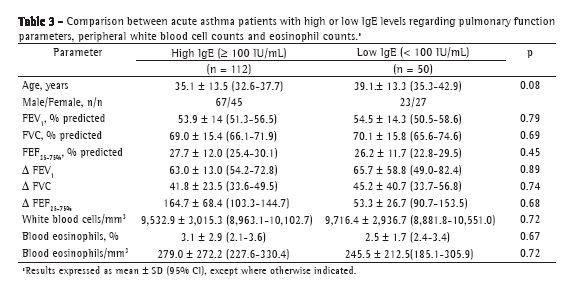 Objetivo: Determinar se há uma relação dos níveis de IgE total no soro e das contagens de eosinófilos com a resposta à farmacoterapia de rotina em pacientes com asma aguda. Métodos: Estudo transversal com 162 pacientes com asma aguda. Foram determinados os níveis séricos de IgE total, as contagens de células no sangue periférico e as contagens de eosinófilos. O tratamento foi ajustado individualmente de acordo com a gravidade da asma. Foi realizada espirometria antes do início do tratamento e duas semanas após seu término. Os pacientes foram divididos em dois grupos: alto nível de IgE (≥ 100 UI/mL) e baixo nível de IgE (< 100 UI/mL). Foram comparadas entre os dois grupos as relações das determinações basais e das alterações em percentual dos seguintes parâmetros: VEF, CVF, FEF25-75%, contagem de células brancas no sangue periférico e contagem de eosinófilos. Resultados: Não houve diferenças significativas entre os grupos em relação às alterações em percentual dos parâmetros estudados. Tampouco houve diferenças significativas entre os grupos em relação aos valores basais de VEF, CVF e FEF25-75%, em % do predito. Conclusões: Com base nesses achados, concluímos que os níveis séricos de IgE total, as contagens de células brancas no sangue periférico e as contagens de eosinófilos não são preditores do tratamento farmacológico de pacientes com asma aguda.