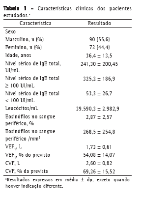 O presente estudo incluiu 162 pacientes com asma (90 homens e 72 mulheres; média de idade de 38,0 ± 14,4 e 34,4 ± 12,0 anos; respectivamente). As características dos pacientes antes do tratamento são descritas na Tabela 1.
