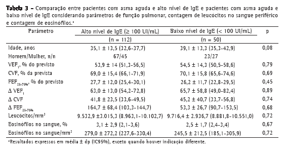Objetivo: Determinar se há uma relação dos níveis de IgE total no soro e das contagens de eosinófilos com a resposta à farmacoterapia de rotina em pacientes com asma aguda. Métodos: Estudo transversal com 162 pacientes com asma aguda. Foram determinados os níveis séricos de IgE total, as contagens de células no sangue periférico e as contagens de eosinófilos. O tratamento foi ajustado individualmente de acordo com a gravidade da asma. Foi realizada espirometria antes do início do tratamento e duas semanas após seu término. Os pacientes foram divididos em dois grupos: alto nível de IgE (≥ 100 UI/mL) e baixo nível de IgE (< 100 UI/mL). Foram comparadas entre os dois grupos as relações das determinações basais e das alterações em percentual dos seguintes parâmetros: VEF, CVF, FEF25-75%, contagem de células brancas no sangue periférico e contagem de eosinófilos. Resultados: Não houve diferenças significativas entre os grupos em relação às alterações em percentual dos parâmetros estudados. Tampouco houve diferenças significativas entre os grupos em relação aos valores basais de VEF, CVF e FEF25-75%, em % do predito. Conclusões: Com base nesses achados, concluímos que os níveis séricos de IgE total, as contagens de células brancas no sangue periférico e as contagens de eosinófilos não são preditores do tratamento farmacológico de pacientes com asma aguda.