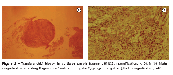 Due to the clinical similarity between zygomycosis and other diseases caused by filamentous fungi, as well as due to the difficulty in making a specific diagnosis, many cases of pulmonary zygomycosis are not suspected in their initial clinical presentation.(22) Therefore, the diagnosis of invasive mycoses requires a high degree of suspicion.(3) The clinical and radiological presentations of zygomycosis and those of aspergillosis are similar. Culture is often negative in both. The radiologist should use invasive techniques to collect the clinical specimen. A CT scan reveals the extent of the lesion, indicates the preferential biopsy site and defines the surgical limits for lesion debridement.(13)
