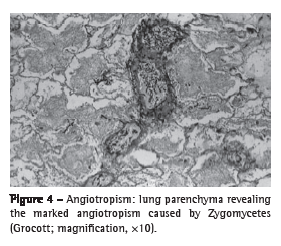 Aspergillosis is the infection that most closely mimics zygomycosis (Table 2). Usually, these mycoses are distinguished by the hyphal morphology. However, this distinction is difficult, particularly when Aspergillus sp. hyphae are macerated or when the lesions contain hyphal fragments.(13)