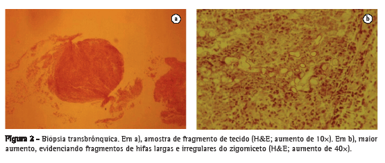 A zigomicose (mucormicose) é uma infecção rara, mas altamente invasiva, causada por fungos da ordem Mucorales (gêneros Rhizopus, Mucor, Rhizomucor, Absidia, Apophysomyces, Saksenaea, Cunninghamella, Cokeromyces e Syncephalastrum). Esse tipo de infecção é usualmente associado a doenças hematológicas, cetoacidose diabética e transplante de órgãos. A apresentação clínica mais frequente é a mucormicose rinocerebral, com ou sem envolvimento pulmonar. A zigomicose pulmonar ocorre mais frequentemente em pacientes com neutropenia profunda e prolongada e pode se apresentar como infiltrado lobar ou segmentar, nódulos isolados, lesões cavitárias, hemorragia ou infarto. As manifestações clínicas e radiológicas são na maioria dos casos indistinguíveis daquelas associadas com aspergilose invasiva. Este artigo descreve as características gerais da zigomicose pulmonar, com ênfase no diagnóstico laboratorial, e ilustra a morfologia de algumas lesões.