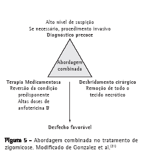 O tratamento de sucesso para zigomicose envolve uma abordagem combinada. O diagnóstico precoce, o pronto início do uso de antifúngicos, a correção do distúrbio metabólico ou a reversão da neutropenia são fundamentais para o sucesso terapêutico (Figura 5).