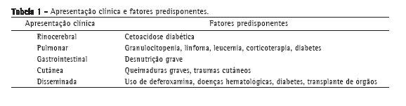 Na mucormicose, o gênero fúngico mais frequente é Rhizopus; entretanto, outros organismos associados com infecção humana são do gênero Mucor, Rhizomucor, Absidia, Apophysomyces, Saksenaea, Cunninghamella, Cokeromyces e Syncephalastrum.(7,8) A apresentação clínica correlaciona-se com as condições predisponentes do hospedeiro (Tabela 1). O curso clínico da doença e a evolução costumam ser fulminantes, devido ao crescimento rápido do fungo e a destruição paralela dos tecidos, o que demanda diagnóstico precoce e pronto tratamento clínico e cirúrgico.(8) A maioria dos casos ocorre em pacientes leucêmicos. No que se refere à mucormicose rinocerebral, caracteristicamente o paciente é diabético com cetoacidose, que no Brasil corresponde à principal manifestação descrita da micose. Porém, as publicações são incompletas, pois não apontam o agente etiológico.(8)