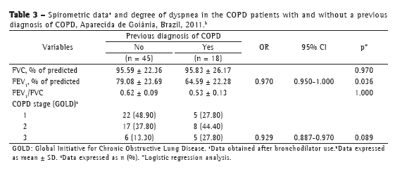 In the present study, the prevalence of symptoms was higher in the COPD patients with a previous diagnosis of COPD than in those without, suggesting that patients with more symptoms are more easily diagnosed. This is worrisome because it suggests that the diagnosis of COPD was made in the advanced stages of the disease, in which the clinical expression of the disease is more severe. This hypothesis has been raised in another study.(16)