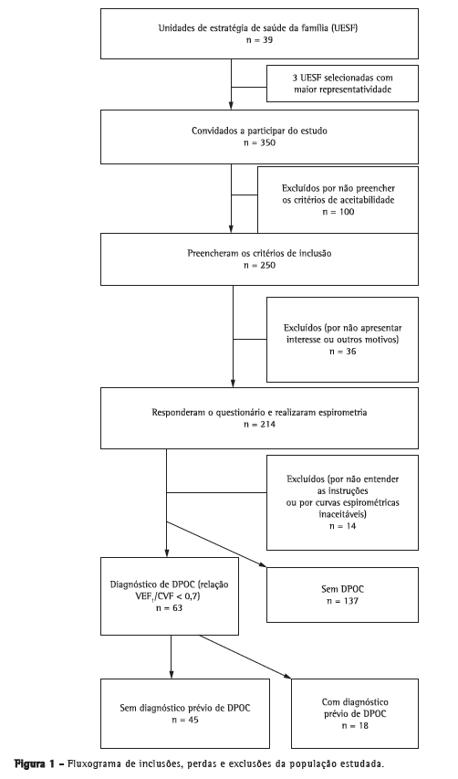 Estudo analítico, observacional, transversal, realizado na cidade de Aparecida de Goiânia (GO), em três Unidades de Estratégia de Saúde da Família (UESF) no período entre maio e setembro de 2011. Contou com o apoio dos gestores da Secretaria Municipal de Saúde de Aparecida de Goiânia, cidade da região metropolitana de Goiânia com população estimada em 500 mil pessoas. O critério de escolha das UESF foi ter a maior representatividade populacional (regiões sul, leste e oeste). Essas unidades correspondem a 27% do atendimento geral das UESF (segundo informações da secretaria municipal). Os indivíduos que procuravam as UESF para atendimento médico ambulatorial de rotina e que não apresentavam sintomas respiratórios agudos foram convidados a responder uma entrevista inicial sobre dados demográficos e fatores de risco para DPOC. Foram incluídos indivíduos com idade maior ou igual a 40 anos, exposição a tabaco igual ou maior que 20 anos-maço ou exposição a queima de biomassa igual ou maior a 80 horas-ano ou ambos e que concordaram em assinar o termo de consentimento livre e esclarecido. Foram excluídos os indivíduos com diagnóstico prévio de asma brônquica, rinite alérgica, doenças pulmonares crônicas que não DPOC e enfermidades extrapulmonares capazes de interferir na função pulmonar, assim como aqueles que não preencheram os requisitos para a realização da espirometria (Figura 1).