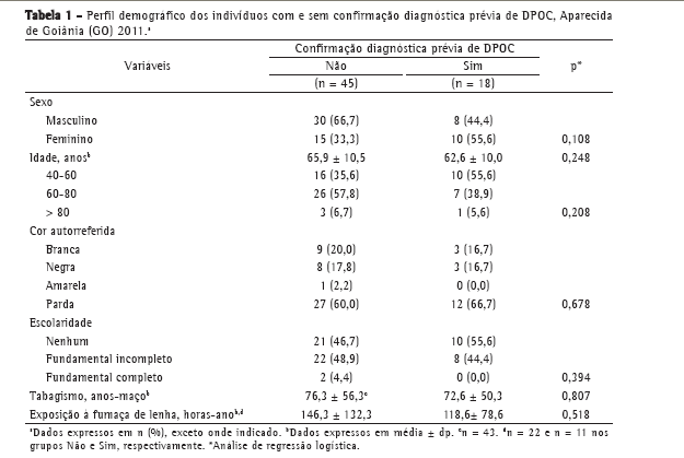 A análise das variáveis sexo, idade, cor e escolaridade não demonstrou diferença estatisticamente significante entre os grupos com e sem diagnóstico prévio de DPOC. Não houve, também, diferenças estatisticamente significantes em relação à carga tabágica e à exposição cumulativa à queima de lenha. No grupo de indivíduos com DPOC sem diagnóstico prévio, a média de idade foi de 65,9 ± 10,5 anos e houve predomínio do sexo masculino, da cor autorreferida parda e de grau de escolaridade ensino fundamental incompleto. Além disso, nesse grupo, a carga tabágica média foi de 76,3 ± 56,3 anos-maço e a exposição cumulativa média à fumaça de lenha foi 146,0 ± 132,3 horas-ano (Tabela 1).