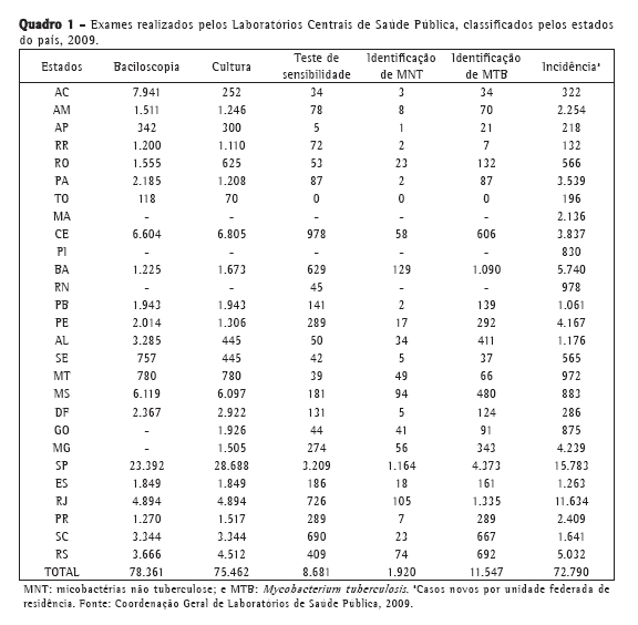 No Brasil, os testes diagnósticos de tuberculose são realizados, majoritariamente, no SISLAB,(7) constituído pelo LRN, 27 LACENs e mais de 3.000 laboratórios locais. Os laboratórios locais realizam baciloscopia, sendo que poucos também realizam cultura e teste de sensibilidade (TS) às drogas.