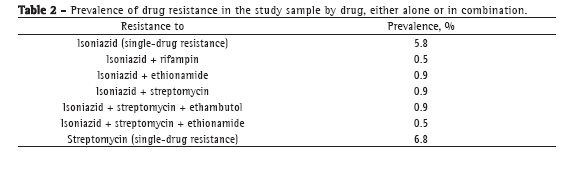 Between 2000 and 2002, a study conducted in the city of Rio de Janeiro and involving a group of 75 patients diagnosed with pulmonary tuberculosis who lived in the Complexo de Manguinhos found resistance to at least one drug in 10.6% of the new cases of tuberculosis.(16) The prevalence of single-drug resistance to isoniazid was 2.6%, and the prevalence of single-drug resistance to streptomycin was 4%. No rifampin-resistant or ethionamide-resistant strains were detected. Although the samples are not comparable, the fact that the Complexo de Manguinhos is located near the IDT/UFRJ Tuberculosis Outpatient Clinic and that the recorded prevalence of drug resistance was nearly half of that seen in our sample one decade later should be a cause for reflection.