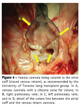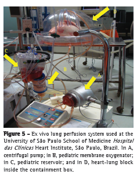 In Brazil, Pêgo-Fernandes et al. began to study EVLP in 2008. In a study published in the Brazilian Journal of Pulmonology in 2009, the authors described a modification of the EVLP circuit aimed at reducing the amount of solution needed for EVLP.(16) The authors described an EVLP system comprising a set of pediatric tubes, a pediatric venous reservoir, and a pediatric membrane oxygenator (Figure 5). The system also comprised a heat exchanger and a centrifugal pump (Braile Biomédica, São José do Rio Preto, Brazil). The heart-lung block remained in a rigid, transparent box (Vitrolife), an orotracheal tube being inserted into the trachea and a perfusion cannula (Vitrolife) being inserted into the main pulmonary artery. The solution returning through the pulmonary veins flowed directly into the containment box, being drained into the venous reservoir by the force of gravity. For lung reconditioning and clinical use, the protocol included closed cannulation of the atrium with special cannulae, as described by the University of Toronto lung transplant group.(15) The system was filled with 1,500 mL of Steen Solution (Vitrolife). In that protocol, EVLP was initiated with the solution at 20°C and an initial flow of 10% of the calculated value, the temperature and flow being gradually increased. When the temperature reached 32°C (20 min after EVLP initiation), ventilation was initiated and a gas (7% CO2 + 93% N2) was released into the system through the membrane oxygenator in order to "deoxygenate" the perfusate coming from the pulmonary veins so that the solution that enters the pulmonary artery has the same gas concentrations as those of the venous blood. The ventilator was set at a tidal volume of 6-8 mL/kg, an RR of 7 breaths/min, an FiO2 of 100%, and a positive end-expiratory pressure of 5 cmH2O. The flow and temperature were increased until a flow of 40% of the estimated cardiac output and a temperature of 37°C were reached (i.e., within approximately 40-60 min). If the pulmonary artery pressure was as high as 20 mmHg before the estimated maximum flow was reached, the maximum flow was kept at a lower value. Within 60 min after the initiation of EVLP, perfusate samples were collected from the pulmonary veins for blood gas analysis. The following parameters were analyzed: PaO2; PaCO2; pulmonary vascular resistance; and lung compliance. The first studies conducted by that group of authors focused on establishing an EVLP model suitable for use in Brazil(17) and on reconditioning lungs deemed unsuitable for transplantation.(18,19)