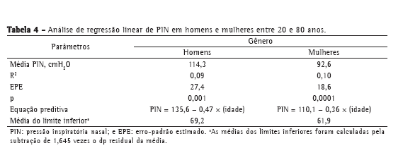Os valores de pressão respiratória estão apresentados na Tabela 2. De forma geral, os valores médios de PImáx, PEmáx e PIN foram significantemente maiores em homens do que em mulheres (114,3 ± 28,6 cmH2O vs. 92,6 ± 19,7 cmH2O; p < 0,05). Em cada gênero, foram também encontradas diferenças significantes entre as faixas etárias (p < 0,05), como mostrado na Tabela 2. As correlações entre PIN e as variáveis estudadas estão apresentadas na Tabela 3. Houve correlação negativa entre PIN e idade tanto para homens (r = −0,29; p < 0,001) como para mulheres (r = −0,33; p < 0,0001). Entretanto, a PIN não se correlacionou significantemente com o peso, altura, IMC ou AFH nos dois gêneros. Após a regressão linear, a única variável que manteve a significância foi a idade, que se mostrou preditora da PIN para homens (p < 0,001) e mulheres (p < 0,0001) e, portanto, foi incluída no modelo das equações preditivas de PIN em função da idade (Tabela 4):