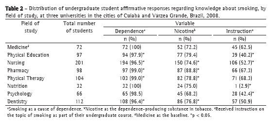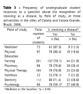 Finally, we suggest that universities offering health care courses include smoking-related themes in their curricula, because, in order to control smoking effectively, we need well-trained professionals who are able to cope with this endemic disease. The results of the present study allow us to conclude that our study population had insufficient knowledge about some of the topics analyzed (smoking as a disease, identity of the dependence-producing substance in tobacco, and the forms of smoking cessation treatment), which suggests inadequacy of the health sciences curricula at the three universities studied.