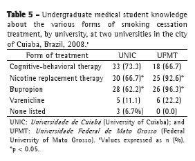 In addition, the comparison between UFMT, which is a public university, and UNIC, which is a private university, revealed that, regarding knowledge about the various forms of smoking cessation treatment (Table 5), the number of correct responses was greater among the UFMT students than among the UNIC students for nicotine replacement therapy (92.6% vs. 66.2%), use of bupropion (96.3% vs. 62.2%), and use of varenicline (22.2% vs. 11.1%), the only exception being for cognitive-behavioral therapy (66.7% vs. 73.3%).