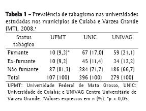 A prevalência de fumantes encontrada nos universitários estudados foi de 17,4%, sendo que as maiores taxas foram nos alunos dos cursos de farmácia da UNIC e de odontologia da UNIC, com prevalência de 29,6% e 25,5%, respectivamente. Em um estudo anterior realizado somente na universidade pública em Cuiabá, mas englobando todos os cursos, observou-se uma prevalência de fumantes menor do que a encontrada no presente estudo, com 6,67% de fumantes.(9) Por outro lado, um estudo realizado em Brasília mostrou que a prevalência do tabagismo entre os universitários apresentou uma taxa semelhante (14,7%).(10)