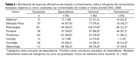 Finalizando, sugerimos que as universidades que oferecem cursos para a formação de profissionais da saúde incluam em suas grades curriculares temas sobre o tabagismo, pois, para o controle efetivo do tabagismo, necessitamos de profissionais capazes e bem preparados no enfrentamento dessa endemia. Assim, os resultados deste estudo permitem concluir que o conhecimento sobre alguns tópicos analisados (tabagismo como doença, substância causadora da dependência e formas de tratamento) eram deficitários nessa população, podendo refletir uma inadequação da grade curricular dos cursos da área de saúde de Cuiabá e Várzea Grande (MT).