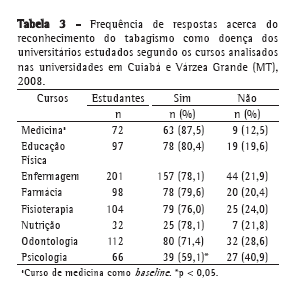 Quanto ao quesito acerca do reconhecimento do tabagismo como doença, percebe-se que a maioria (79,2%) respondeu positivamente (Tabela 3). Ao analisar esse quesito por curso de graduação, o maior percentual de respostas positivas foi dos alunos da medicina (87,5%), seguidos dos alunos do curso de educação física (80,4%). O menor percentual de acertos foi dos alunos do curso de psicologia (59,1%).