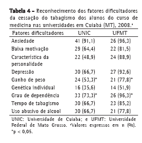 Somente para os alunos de medicina, ao analisarmos outros conhecimentos, os resultados desta pesquisa mostraram que, dentre os fatores dificultadores listados, a ansiedade e o grau de dependência foram os mais citados pelos entrevistados. As diferentes reações ocorridas no organismo quando da cessação do tabaco devem ser conhecidas pelos futuros médicos, pois serão eles que irão prescrever (ou não) os medicamentos que auxiliam os pacientes que desenvolvem sintomas da abstinência.(17) Dentre outros fatores dificultadores da cessação que todo profissional da saúde deveria saber destacam-se ainda a baixa motivação do paciente,(18) sua personalidade, as doenças psiquiátricas coexistentes e o ganho de peso.(19,20)