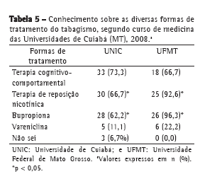 O conhecimento sobre as diversas formas de tratamento do tabagismo, na comparação entre as duas universidades (UFMT vs. UNIC), mais uma vez mostra que os alunos da faculdade pública tiveram mais acertos: foram citados terapia de reposição nicotínica (92,6% vs. 66,2%), uso de bupropiona (96,3% vs. 62,2%) e uso de vareniclina (22,2% vs. 11,1%). Os alunos da universidade particular somente tiveram um maior número de acerto em relação a terapia cognitivo-comportamental (66,7% vs. 73,3%), como mostra a Tabela 5.