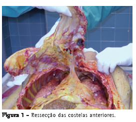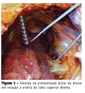Inicialmente, o dreno era inserido perpendicularmente na parede torácica, na altura do segundo espaço intercostal, na linha hemiclavicular, bilateralmente. O esterno era seccionado transversalmente, com a retirada de toda a parede torácica anterior (plastrão esternal), aproximadamente na altura do quarto espaço intercostal (Figura 1). Nesse momento, a espessura da parede torácica era medida bilateralmente, próxima ao orifício de colocação do dreno. Com a exposição da cavidade pleural, o pulmão encontrava-se atelectasiado, e a extremidade distal do dreno estava inserida nessa cavidade (Figura 2). Com o pulmão em sua posição anatômica e tendo-se como referência a extremidade distal intratorácica do dreno, media-se, com o uso de uma régua, a distância do mesmo com as seguintes estruturas: brônquios principais direito e esquerdo, brônquios do lobo superior direito e esquerdo, artéria para o lobo superior direito e esquerdo, artéria pulmonar direita e esquerda, assim como veia e artéria subclávia direita e esquerda (Figura 3). O pulmão então era rechaçado, sendo medida, à esquerda, a distância do dreno com o arco aórtico e, à direita, com a veia ázigos.