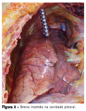 Não há diferença entre a espessura da parede do lado esquerdo e do lado direito, sendo que sua média é de 2,9 cm; como o dreno mede 7,5 cm, havia, portanto, 4,6 cm de dreno intratorácico disponível para penetrar no pulmão dos cadáveres. Nos pacientes operados, no ato cirúrgico, insere-se aproximadamente 5 cm de dreno dentro do parênquima. Do ponto de vista clínico, esse valor parece ser seguro, uma vez que não houve nenhum sangramento importante no ato operatório, e, ao mesmo tempo, eficaz, permitindo satisfatoriamente a drenagem do ar aprisionado. Dos nove casos operados, houve um único episódio de sangramento pela estomia no período pós-operatório tardio. Na ocasião, a TC de tórax mostrava íntimo contato da extremidade distal do dreno com vasos periféricos do parênquima pulmonar mas não aos do hilo. O aparecimento tardio de sangramento sugere uma neoformação vascular relacionada ao processo inflamatório local do tipo corpo estranho. Uma vez retirado o dreno, o sangramento cessou, e a estomia cicatrizou espontaneamente.