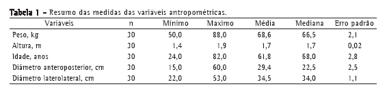 Através da Tabela 1, nota-se que o peso médio dos cadáveres operados foi de 68,6 ± 2,1 kg e mediana de 66,5 kg. A média de altura foi 1,70 ± 0,02 m e mediana de 1,70 m. A média do diâmetro posteroanterior foi de 29,4 ± 2,8 cm e mediana de 22,5 cm. Já a média do diâmetro laterolateral foi de 34,5 ± 1,1 cm e mediana de 34,0 cm.