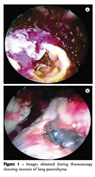 Thoracoscopy provides a broad view of the pleural cavity, as well as allowing the sectioning of pleural adherences, the suction of collections and the removal of excess fibrin deposited on the parietal and visceral pleurae.(4,5) In some cases, thoracoscopy has revealed focal pulmonary necrosis, also known as pulmonary gangrene or necrotizing pneumonia (NP).(6)